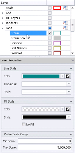 The Layer Properties pane appears immediately below the Layer Legend pane. The Layer Properties pane displays the options available for a given layer selected in the Layer Legend pane. The Visible Scale Range, which specifies the minimum and maximum map scale at which a given layer appears, can be set for each individual layer.