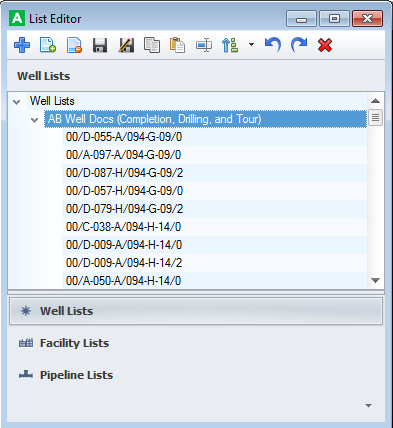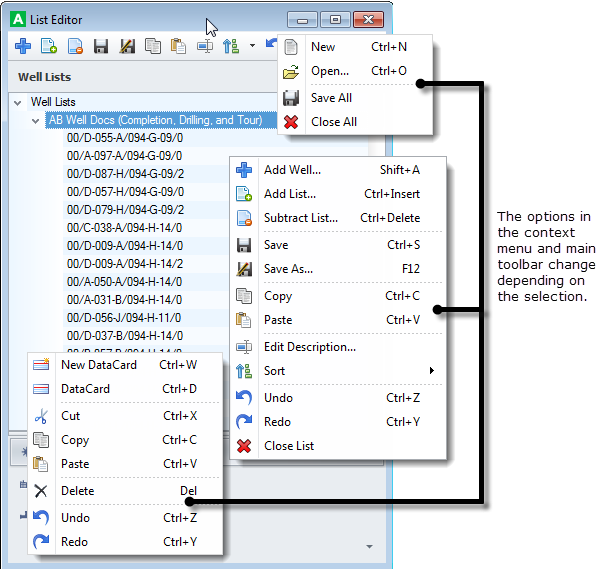 Toolbar options at the top of the List Editor dialog box and in the context menu change depending on whether you select the root node, a list, or an item in a list.