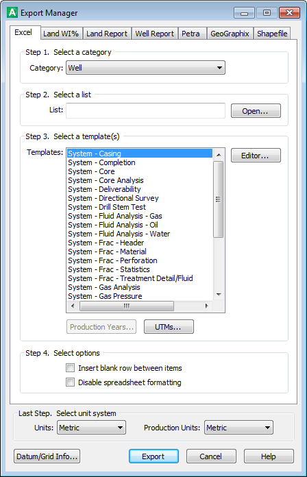 - Select additional options including the measurement units, whether to insert blank rows between each exported item, and for Canadian data, whether to use a NAD83 or NAD27 datum reference with either the 2.6 or 4.1 ATS grid by clicking Datum/Grid Info. Note that by default, the list is exported using the datum option defined in the Datum Settings pane of the AccuMap Defaults dialog box (Edit > Defaults menu).