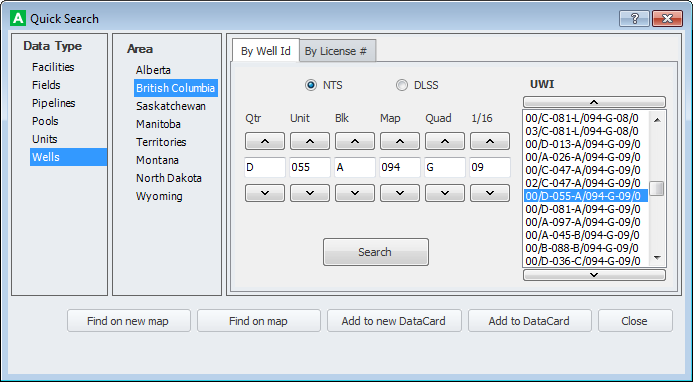 ) to display the Quick Search dialog box where you select a data type, area, and then type the ID of items to add to either a new or existing DataCard and click Search. Select the item(s) from the results (Ctrl+Click or Shift+Click for multiple selection), and then click either Add to New DataCard or Add to DataCard depending on whether to launch a new DataCard or to add the item(s) to the bottom of a data type group (Well, Pipeline, Facility, etc.) of the Data Navigator pane in the current DataCard. Note that an item can only be added to the same DataCard once.