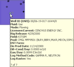 ), or press the SPACEBAR to scroll through layers until information for the desired item appears in the Inspect tooltip, and then click to display details for that item in the DataCard. For example, below the Wells layer is covered by the Pool layer, which overlaps with seven other pools, and the Inspect tooltip indicates so. To display the well in the DataCard, simply press SPACEBAR to scroll through each of the overlapping pools until the well summary appears in the Inspect tooltip and then click.