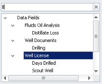 - Expand the data groups to select a data field with which to query. Limit the data fields that appear in the pane by typing the adjacent letters that appear anywhere in the desired data field using the Filter Data Fields pane as depicted below.