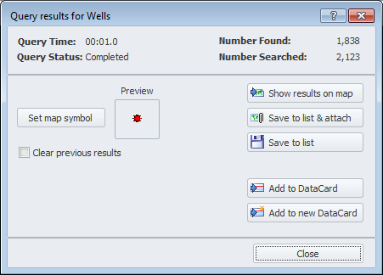 - Save to List and Attach - click to save the query results as a list, which is then attached to the map and visible in the Layer Legend under the Lists node. Even if the query isn't saved, when you close and open the Query dialog box, the query appears. If you save the map but neglect to save the query that appears in the Query dialog box, the query is automatically saved along with the map and appears the next time you display the saved map and open the Query dialog box.