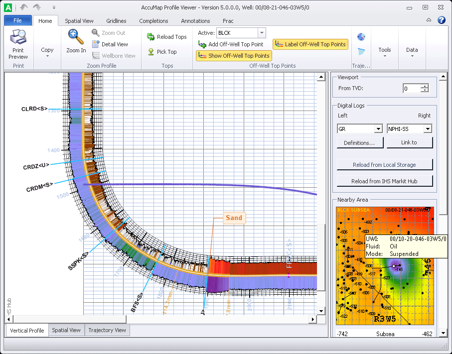 To further customize the Nearby Area pane, including the color scheme, wells to display, and off-well tops and depths, click the Spatial View tab in the Main ribbon.