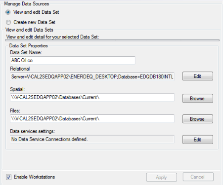 Select the existing active data set in the View and edit detail... pane, and then review the Data Set Properties pane to determine the paths to the active spatial and relational data sources (and the root directory of well and land images, and basin monitor PDFs). Point to different data sources with the data set you're about to create.