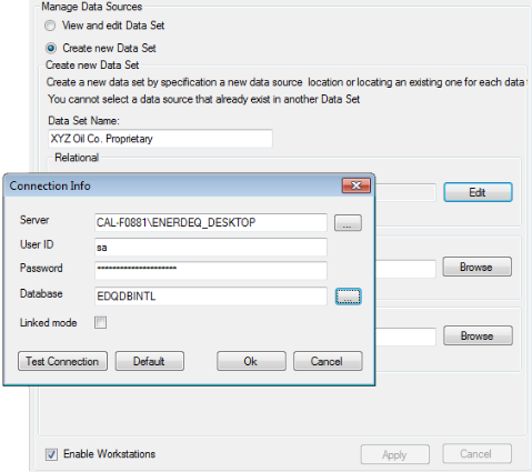 4. Type a unique name for the data set, and then using the EDIN Relational box, click Edit and populate the Server, credentials, database, and whether to run in Linked mode for the database, and then click OK.