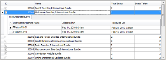 Compare the total and occupied seats for each EDIN data module to which you're entitled. For each module, expand the node to view the user name and the date and time of their session.