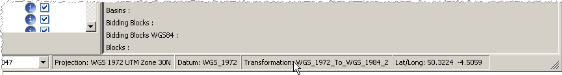 The map projection and transformation applied appears in the status bar below the map.