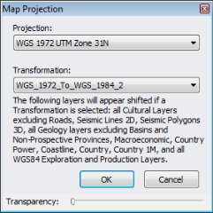 The map projection automatically changes to one of several defaults as your map center point and scale changes, but you can override these defaults by selecting a different map projection and a different transformation algorithm if data appears shifted. Selections affect both map display and map exports when your map scale is within the range to which the selected projection pertains.