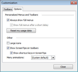 1. Using the window to customize, from the Tools menu, click Customize, and then click the Options tab.