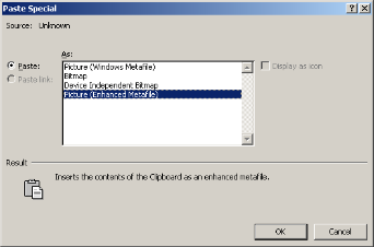 2. Launch the desired third-party application and using that application's Edit menu, click Paste Special, and select either Bitmap or Enhanced Metafile format as depicted, and then click OK.