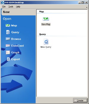 Using the left pane of the IHS EDIN Desktop toolbar, launch either a new Map window or Query Editor, or open a saved file. Files saved using the Map window can be opened using only the Map window. Files saved using Query Editor or an Output window (Browse, DataCard, Graph, Export ) can be opened in Query Editor or in any Output window.