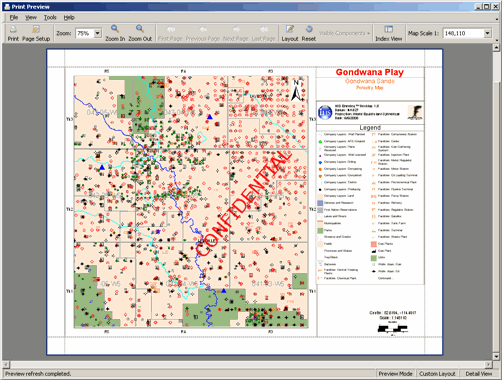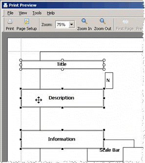 Click the Layout option while in Print Preview mode to customize the map by dragging, dropping, resizing, and hiding map objects. Layout options only apply to the current Map window and only persist for the current session.