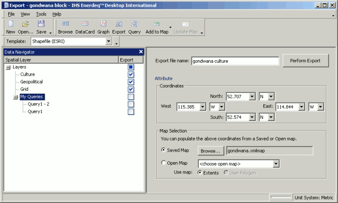 All licensed spatial layers appear in Data Navigator with the currently displayed layers in either the open or saved map selected for export.