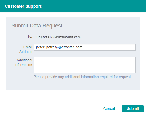 > Can't find the data you're looking for? the Customer Support modal window appears. Attached is a text file that includes your user name, entitlements, latest search term, grid state, and browser version. Type any additional details in the Additional Information pane and then click Submit. These details are also CC'd to your email address.