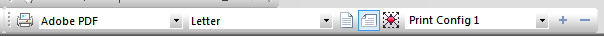 From left-to-right, the icons enable you to select a printer, select paper format, select letter or landscape orientation, reset the print configuration view, select the print configuration area for viewing, and add or remove print configurations.