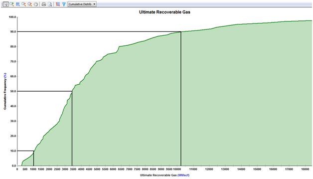 The black horizontal lines originating at cumulative frequencies of 10%, 50%, and 90% intersect the CDF curve, and then line up with the P90, P50, and P10 values of that dataset, respectively.