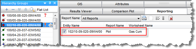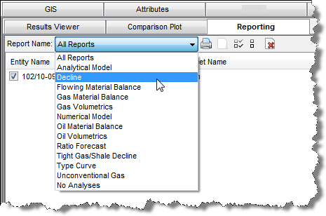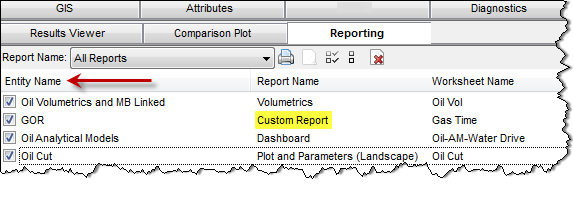 The Reporting tab is used as a print queue to batch print reports from multiple entities. Reports are displayed in a table that displays the entity name, report name (as shown in the Print menu for the worksheet), and worksheet name. Queued reports can be filtered based on analysis type using the drop-down menu in the toolbar.