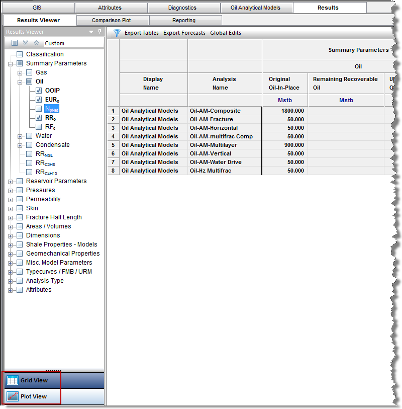 Click the Grid View button, and then click the checkboxes in the selection tree on the left to add or remove results from the table. Note that table rows are displayed in the order that checkboxes are clicked in the Results Viewer selection tree.