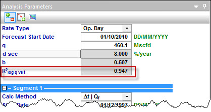 Once the fit is created, you can evaluate its quality using the "goodness of fit" parameter (R2log q vs. t) located in the Analysis Parameters pane. Better fits are indicated by the goodness of fit parameter being closer to 1.