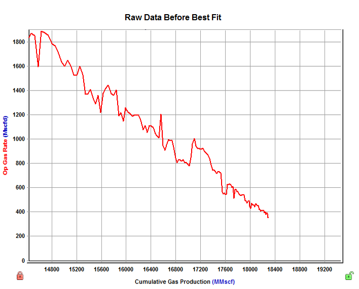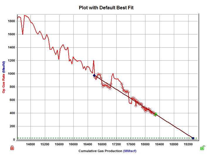 Adding an analysis to a plot creates an analysis line based on the last 50% of the data points. (The Initial Best Fit percentage can be modified in the Decline and Water Oil Ratio sections of the Options dialog box.)
