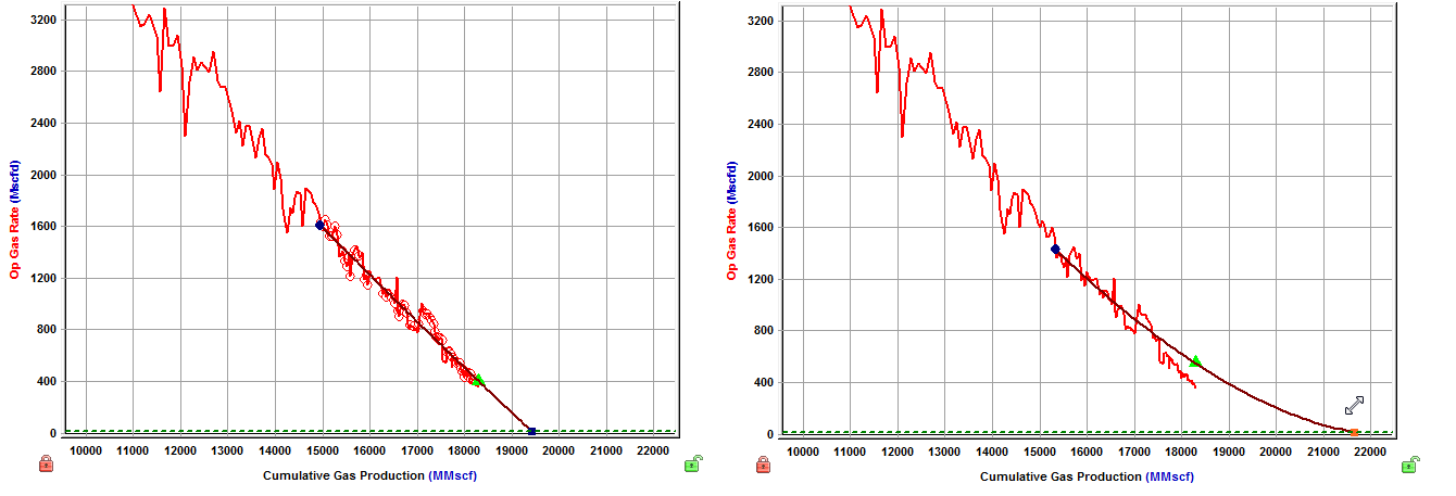 To change the abandonment rate, drag the end point while holding down the Shift key. The final rate, cumulative production, and forecast duration are changed without changing the decline exponent, or effective decline rate.