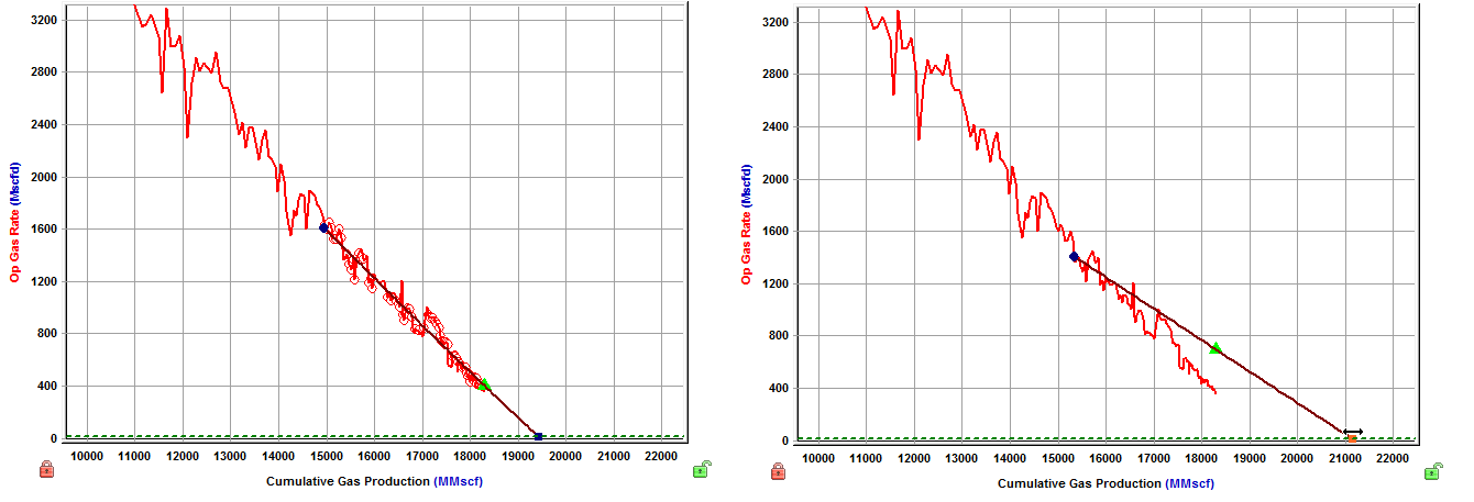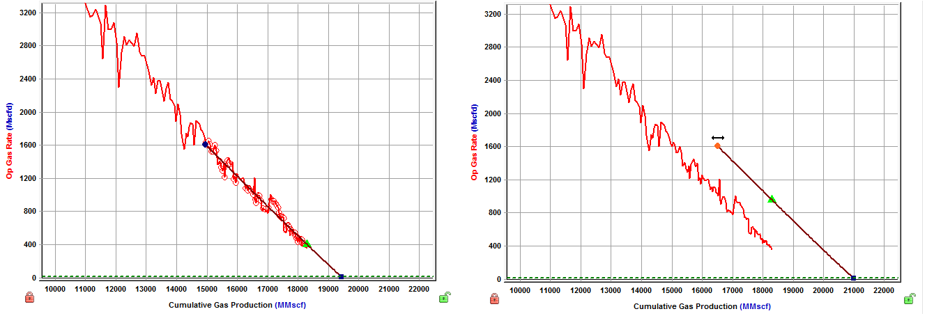 To change the initial cumulative production and final cumulative production, click-and-drag the left point while holding down the Ctrl key. This changes the start point without changing the initial oil / gas rate or decline rate.