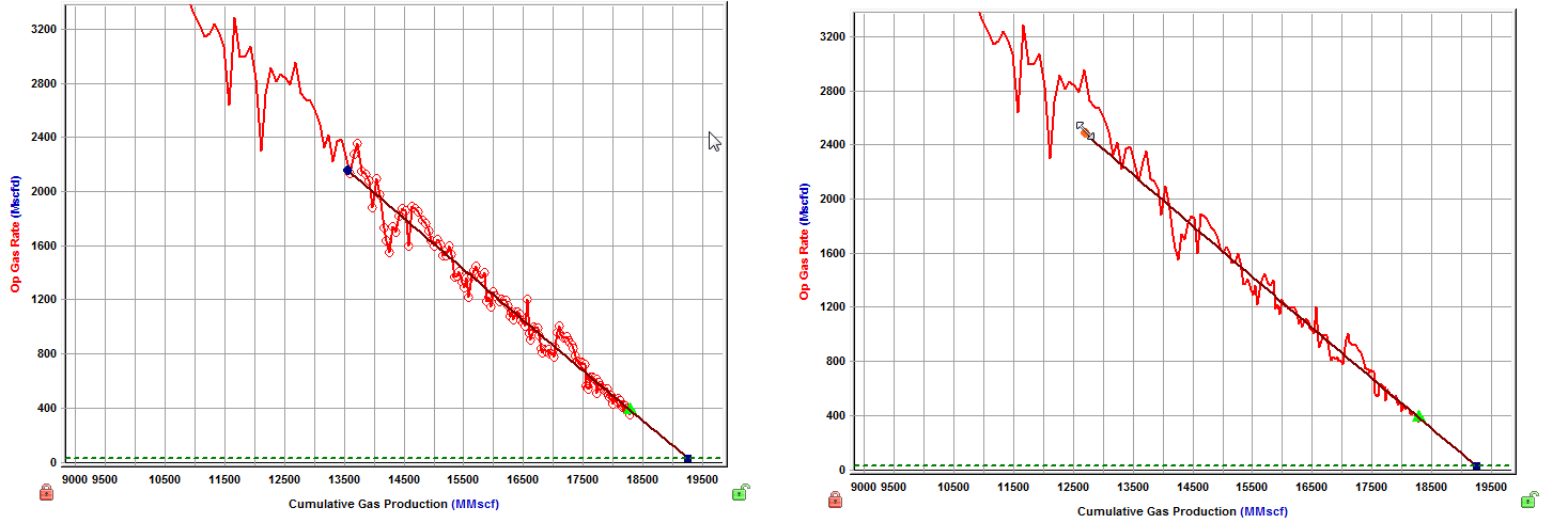 Note: There are fewer curve manipulations available for a tight-gas decline (because the b value is locked at 2 for transient flow, and 0.5 for boundary-determined flow), so point selection tends to be an easier way to create a best fit.