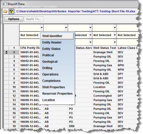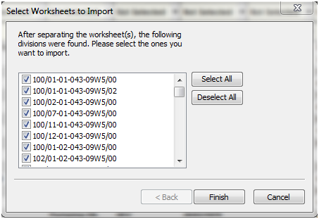 - Separate...button (Available only if Production data is chosen; not available for Attributes.) — you can specify a Well Name column in the original worksheet and subsequently list multiple wells in the same worksheet. Assigning Well Identifier in the data column header divides the single import file into multiple entities for import, each one named according to an entity header attribute listed in the original file.