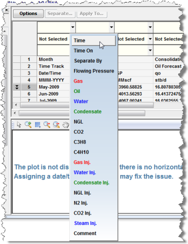 Note: You must assign a Time and Date Time column (when using Production data), and a Well Identifier and a second column (when using Attribute data).