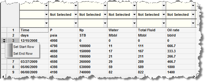 The Import Data utility assigns start and end rows to the dataset. The start row (the first entry populated in Harmony's production or attributes table) is indicated by two arrows pointing down in the far left column. The end row (the last entry populated in Harmony's production or attributes table) is indicated by two arrows pointing upwards in the far left column. Check that the correct rows are assigned as the start and end rows, and modify if necessary. To modify a row, right-click in the row, then select Set Start Row or Set End Row.