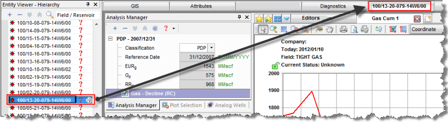 In order to create worksheets and analyze well data in Harmony, you must first launch an entity, which opens that entity in the Analysis tab. The tab name changes to the name of the entity, and displays the available worksheet thumbnails. You can also click the Editors tab in the row below.