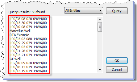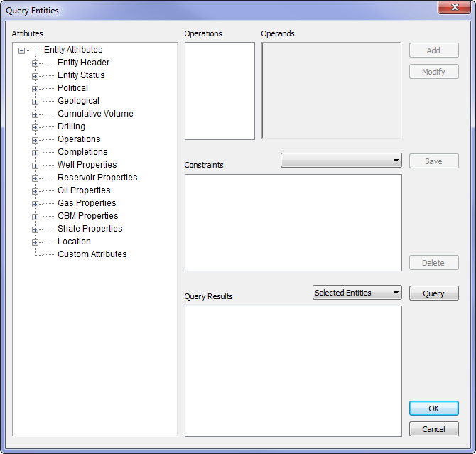 By querying wells, you can search the Entity Viewer for wells with specific attributes. You may use any combination of attributes to locate a subset of your wells, and you can save your searches for re-use.