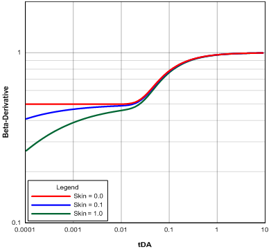 Actual production is oftentimes affected by non-ideal conditions near the wellbore, which manifest as an extra pressure drop at the sandface. In modeling, this extra pressure is treated as a skin effect. Figure 4 shows the β-derivative plot for a skin-free constant rate production alongside two other plots for the same production scenario but with skin effects present. It is observed that the classic 'S' signature of the beta-derivative is distorted in the presence of skin. Therefore, skin masks the sought-after signal in a β-derivative plot.