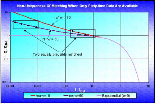 The above figure shows that for all sizes of reservoirs, when transient flow ends, the boundary-dominated flow can be represented by an exponential decline. A well producing at constant pressure will follow one of these curves. One reason for the success of Fetkovich typecurves is that most oil wells are produced at wide-open conditions (ie. at the lowest possible constant pressure). In addition, the above early-time plot gives the impression that by matching the early-time data on one of these curves, it is possible to identify the dimensionless reservoir size. Hence by implication, if the wellbore radius were known, the reservoir size could be determined. However this is a false impression which occurs because of the axes used for plotting. Keep in mind at all times, that the early-time curves represent transient flow, and by definition, the reservoir size cannot be determined from this data alone. If the only data available were in the early-time regime, a unique match could not be obtained. What appears as a possible match on one dimensionless reservoir size curve will also match another dimensionless reservoir size curve at a different location (note that the curves extend to earlier times). An example of a non-unique match of transient data is shown below.