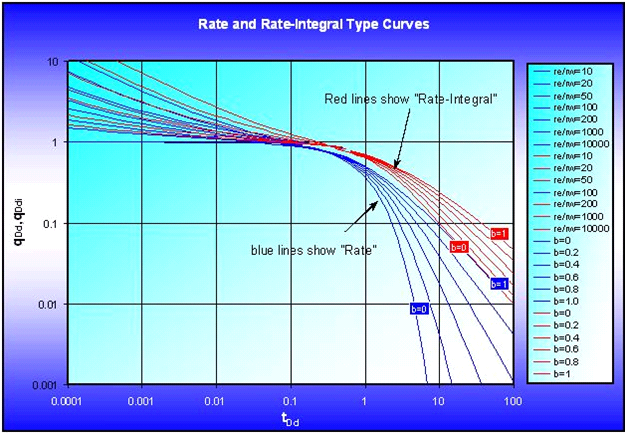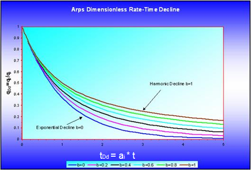 is presented in graphical form it can be seen to encompass the whole range of conditions from exponential decline (b = 0) to harmonic decline (b = 1), where each value of initial rate (qi), initial nominal decline rate (ai), and decline exponent (b) will produce its own unique curve. Fetkovich generalized these curves by making the equation dimensionless.