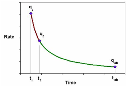 The Fetkovich typecurve graph consists of the following two sections which have been blended to be continuous and thereby encompass the entire production life, from transient to boundary-dominated flow: