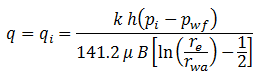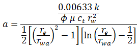 Thus, Fetkovich has demonstrated that Arps’ empirical exponential decline curve has a solid theoretical basis, as the late-time solution to the "constant wellbore flowing pressure" case. From the above equations, the decline coefficient (a) is seen to be a function of rock and fluid properties as well as drainage size, and is independent of the wellbore flowing pressure (for slightly compressible fluids).