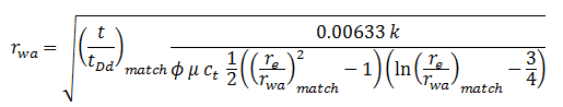 It is only when the production data extends into the boundary-dominated flow region that the different dimensionless reservoir size branches can be used to determine the actual reservoir size. Matching of the data to the typecurves becomes much more unique. Matching of the late-time data gives an indication of the reserves, which in turn is a direct function of the reservoir size. With the knowledge of reservoir size and the match of the transient data, the dimensionless reservoir size parameter can then be used to calculate the effective wellbore radius (rwe), from which the skin factor (s) can be obtained using the following equation:
