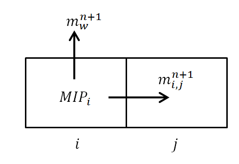 Therefore, equation 2 can be modified to account for changing properties. The mass flow from cell i to cell j during timestep n+1 is calculated as: