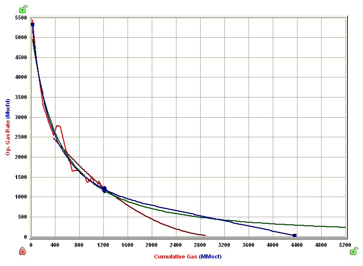 With the modified hyperbolic, dlim, you can use a larger decline exponent while limiting how low the decline rate becomes. In this case, hyperbolic decline with a limited effective decline rate of 10% is used. It provides a more optimistic forecast than hyperbolic decline, but restricts the unreasonably low decline rates shown in superbolic decline forecasts. However, in practice the dlim is often selected arbitrarily.