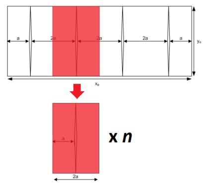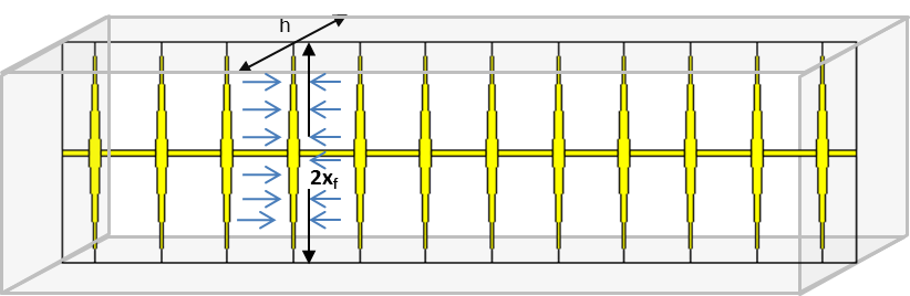 The majority of wells in unconventional gas production are horizontal wells with multiple stage fracturing. The approach first considered with the development of this method is to treat the horizontal wellbore as a fracture, and incorporate fracture stimulation in this well as part of the effective permeability interpreted on the square-root time plot. An additional method has been incorporated using the same process as that developed for a single fracture. If the horizontal well is cased, or contributes very little production compared to the fractures, the well can be treated as a series of fractures in the reservoir. In a well with n equally spaced and identically sized fractures, the single fracture model can be multiplied by n fractures to represent the whole well. The linear flow into the fractures is followed by boundary-dominated flow when no-flow boundaries are formed between adjacent fractures. This layout is displayed below with its relationship to the single-fracture model.