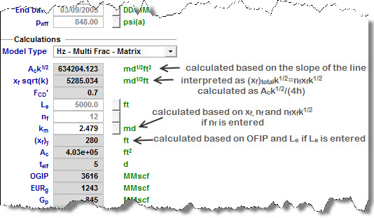 In equations 20a and 20b, the right-side of the equation is known: m, and is defined by production data (the slope of the line for normalized pressure plotted against a function ), and the remaining parameters are known for reservoir and fluid properties. Therefore, we can calculate the linear flow parameter