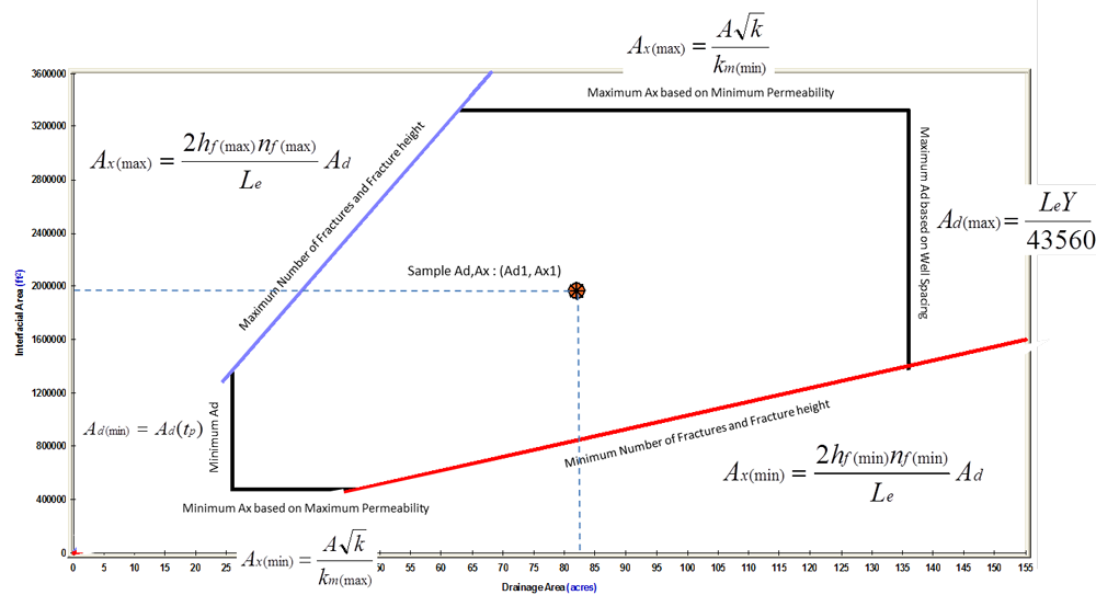 The method is graphics-based with a plot of the exposed area of the fractures (Ax) versus drainage area of the reservoir (Ad). Based on user-defined constraints and limits, this plot defines a region that contains the full set of possible SRV configurations.