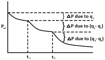 Superposition is a mathematical tool. You can use simple solutions (such as constant rates) to produce complex ones (such as variable rates). Superposition uses the theory that a rate that changes from q1 at time t to a new rate q2 is equivalent to q1 continuing forever, superposed, or added on (q2 - q1) starting at time t and continuing forever.