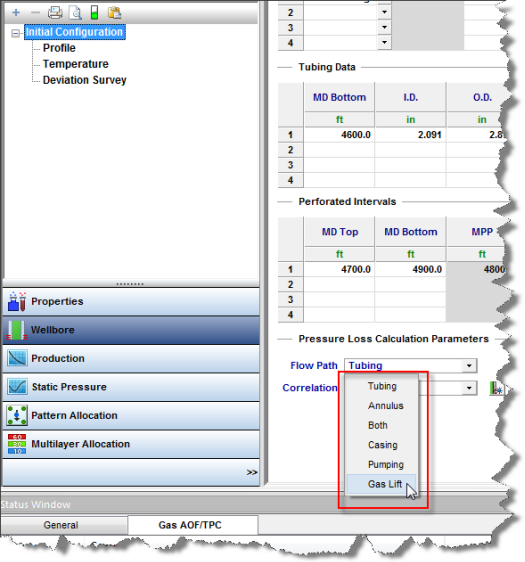 2. Click the Flow Path drop-down menu in the Pressure Loss Calculation Parameters section, and select Gas Lift. See Entering Wellbore Data for additional information.