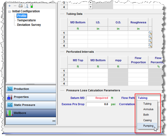 2. Click the Flow Path drop-down menu in the Pressure Loss Calculation Parameters section, and select Pumping. See Entering Wellbore Data for additional information.