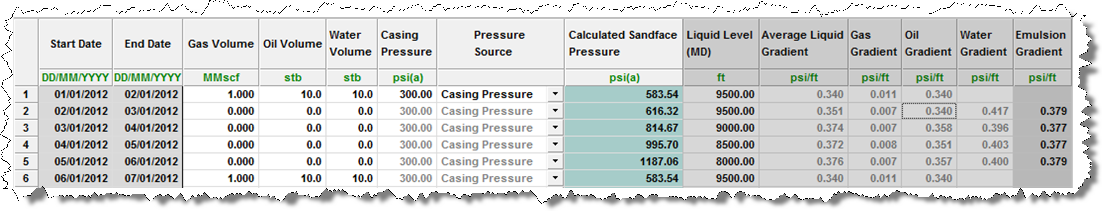 The first shut-in row sets the height of the static oil column. If the liquid level rises, the oil column also rises, followed by an emulsion. The WOR of the last producing row is used to calculate the emulsion gradient for all of the following shut-in rows in this period until the well begins to flow again.