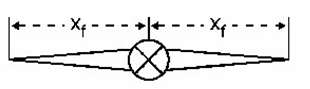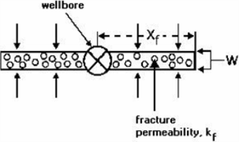 A hydraulic fracture is typically modeled by assuming it extends in a straight line equally on each side of the wellbore as shown in the following diagram.