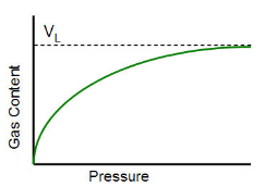 The Langmuir Volume is the maximum amount of gas that can be adsorbed to coal or shale at infinite pressure. The following plot of a Langmuir isotherm demonstrates that gas content asymptotically approaches the Langmuir volume as pressure increases to infinity.